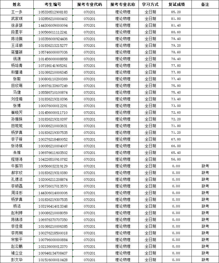 按照学校复试工作安排,我院理论物理专业于2026年4月9日进行了硕士研究生复试工作。现对该专业考生复试成绩予以公布。