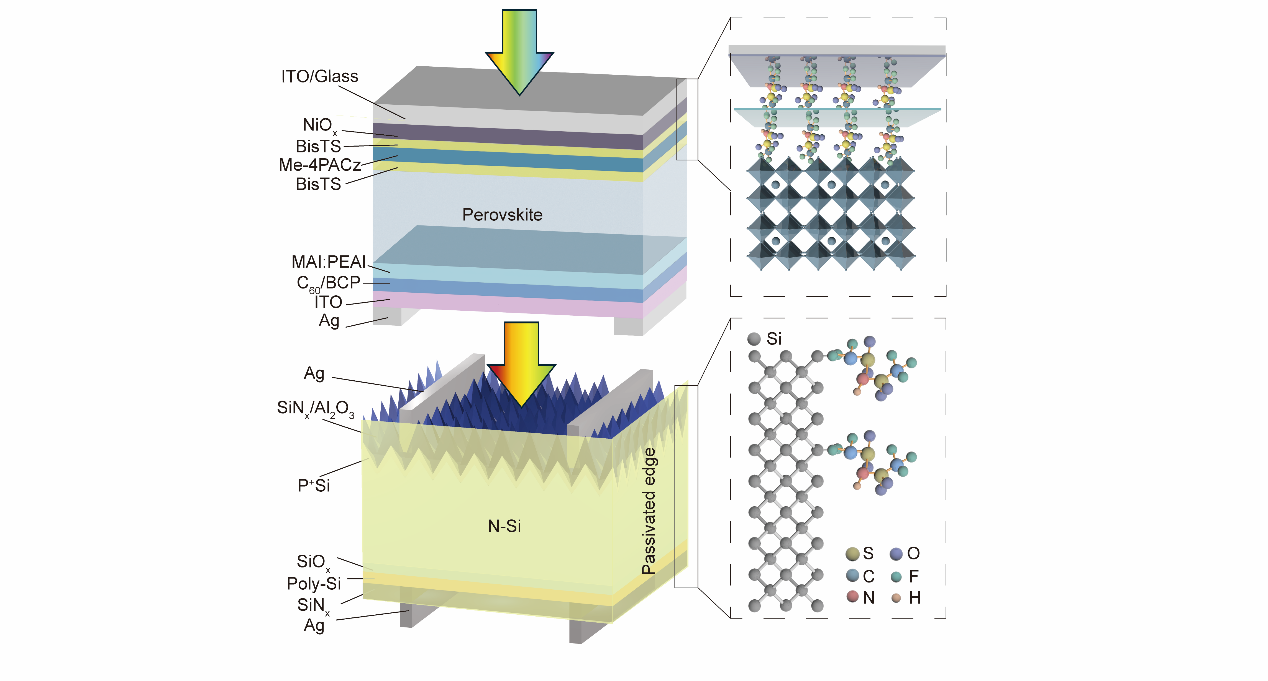 在本项研究中,团队研究设计了一种多位点钝化剂BisTS,可同时钝化①空穴传输层(NiOₓ)表面、②钙钛矿埋底界面和③硅电池边缘三个位点的缺陷,显著提升了钙钛矿/硅叠层太阳能电池的效率和稳定性,开创"缺陷精准打击+性能全面提升"的界面优化新范式。