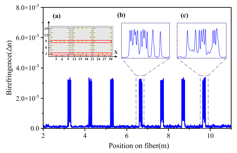 传统电子触觉传感器阵列通常需要为每个传感节点配备独立的数据通道和电源线,导致布线复杂、功耗高、易受电磁干扰,且难以实现大面积、高分辨率的多点同时感知。我院姚晓天教授课题组创新性地提出了 “分布式偏振分析(DPA)”结合单模光纤的解决方案。研究人员将一根光纤以蛇形蜿蜒的方式铺设在由柔性不锈钢箔制成的触摸点阵列与基底之间。当外力按压触摸点时,会通过光弹性效应在下方光纤局部产生与压力成正比的双折射变化。团队开发的高精度DPA系统,能够实时解析沿光纤每一点的双折射信息,并将其精确换算为对应触觉节点所受压力的大小与位置。这意味着,仅凭一根光纤,就能同时实现成百上千个触觉节点的独立、同步感知。实验表明,这款光学智能皮肤展现出优异的综合性能:传感节点密度最高可达100个/平方厘米,空间分辨率达1毫米。最小可检测力低至3.3×10⁻⁴ N(约0.034克力),最大可检测力达8.4N,动态范围高达44dB。传感节点输出与施加压力呈优异线性关系,保证了测量的准确性与可靠性。系统可同时识别并定位大面积皮肤上多个点的压力分布,并成功演示了对52个节点同时施加压力时的精确成像。